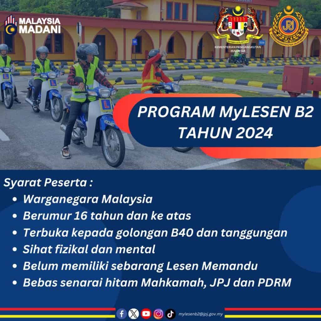 Bantuan Lesen 2024 (MyLesen) – Untuk tahun 2024, Program MyLesen B2 akan diteruskan oleh kerajaan dengan kerjasama Kementerian Pengangkutan Malaysia (MOT) dan Jabatan Pengangkutan Jalan Malaysia (JPJ). Program ini bertujuan untuk membantu rakyat Malaysia mendapatkan lesen memandu motosikal kelas B2.