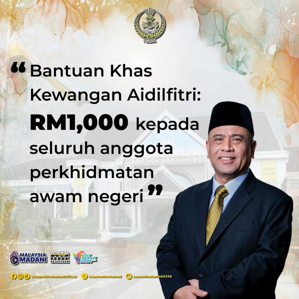 Sebagai rekod, tahun lalu kerajaan Perak mengumumkan Bantuan Khas Kewangan (BKK) Aidilfitri RM700 kepada seluruh penjawat awam
